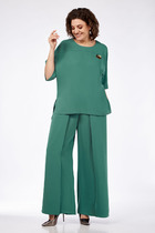 Костюм из кулирки с бриджами. Кофта прямого силуэта, воротник отложной, застежка-планка на три пуговицы. Рукав короткий, низ асимметричный. Нагрудный карман.