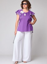 Костюм состоит из туники и брюк. Брюки на поясе, с лампасами из отделочного полотна вдоль боковых швов. Туника полуприлегающего силуэта, с округлой горловиной, длиной до середины бедра. Рукав втачной, длинный, со вставкой из отделочного полотна. Разные расцветки клетки