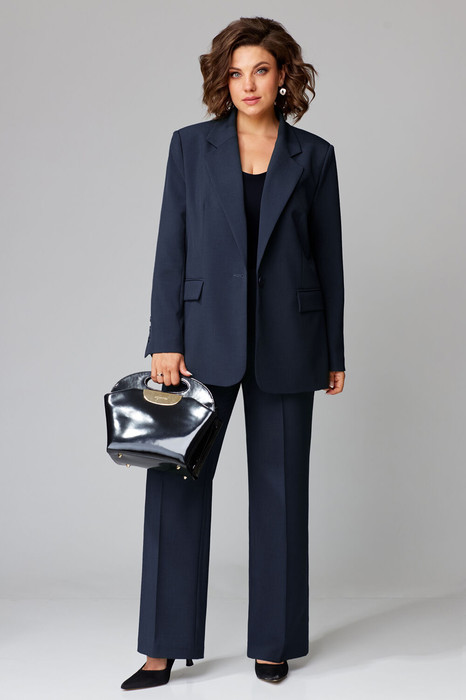 Брюки прямого силуэта с заутюженными стрелками и притачным поясом. Для максимально комфортной посадки по бокам пояса вставлена эластичная резинка. Застёжка на молнию с гульфиком и пуговица по поясу. По переду в боковых швах карманы. Задние половинки брюк с талиевыми вытачками.  Длина жакета 74 см, длина рукава 62 см, длина брюк 112см.