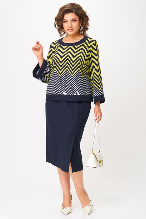 Стильный и гармоничный костюм состоит из блузки и юбки. Геометрический принт блузки притягивать к себе взгляд. Блузка прямого силуэта с нагрудными вытачками и декоративной отделкой по горловине, низу изделия и низу рукава. Рукав втачной одношовный. Спинка без особенностей. Юбка прямого силуэта со шлицей спереди по левой части. Пояс притачной с эластичной тесьмой по спинке, что обеспечивает максимально комфортную посадку на любой тип фигуры.