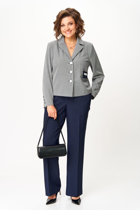 Комплект женский состоит из жакета и брюк. Элегантный женский жакет без подкладки с воротником пиджачного типа и застежкой на 3-и петли и пуговицы. По левой части переда накладной карман с декоративной нашивкой. Рукав втачной двухшовный со шлицей по низу и  пуговицами. Брюки прямого силуэта с заутюженными стрелками и притачным поясом. Для максимально комфортной посадки по бокам пояса вставлена эластичная резинка. Застёжка на молнию с гульфиком и пуговица по поясу. По переду в боковых швах карманы. Задние половинки брюк с талевыми вытачками.