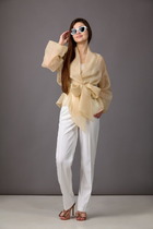 Лаконичный крой, модные цвета и идеальная  посадка делают этот комплект-тройку актуальным во все времена! Жакет полуприлегающего силуэта с центральной застежкой на одну пробивную петлю и пуговицу. Перед с рельефными швами, с горизонтальными карманами с клапаном и двумя обтачками. Спинка со средним швом и рельефными швами, выходящими от линии проймы. Рукава втачные, двухшовные, низ декорирован пришивной пуговицей. Воротник – втачная стойка. Жакет на подкладке и с плечевыми накладками. Блуза полуприлегающего силуэта с фигурной линией низа. Перед с нагрудными вытачками. Застежка по центру горловины спинки на навесную петлю и пуговицу. Рукава – крылышко со сборкой по окату. Юбка зауженная к низу, на притачном поясе, застегивающемся на одну  петлю и пуговицу. Застежка в среднем шве заднего полотнища на потайную тесьму-молнию. Переднее полотнище с талиевыми вытачками. Заднее полотнище с талиевыми вытачками и средним швом, заканчивающимся шлицей. Юбка на подкладке.