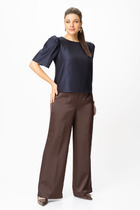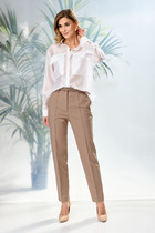 Брюки прямого силуэта на притачном поясе. По переду застежка на тесьму-молнию. По боковым действующие карманы.