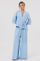 Брюки палаццо свободного кроя с поясом на резинке. По переду декоративная деталь с пряжкой, иммитация застежки. В боковых швах брюк карманы.