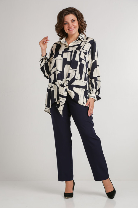 Брючный комплект состоит из блузки и брюк. Блузка из сатиновой ткани очень лёгкая и в тоже время не просвечивается. Втачной рукав по низу манжета с пуговицей, она подворачивается(по желанию).Воротник мужской на стойке.По переду планка на одну пуговицу, с низу блузка завязывается на узел. Спинка свободного силуэта полукруглая,немного длиннее переда. Брюки классические на поясе с резинкой. Застёжка на гульфик и тесьму-молнию.