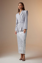 Костюм женский тройка, состоящий из облегчённого жакета, блузки и брюк. Жакет удлинённый выполнен из трикотажа букле прямого силуэта, линия плеча слега спущена, рукав длинной 7/8. Застежка центральная на притачных планках, по полочке в области бёдер обработаны накладные карманы.
