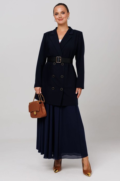 Женский  деловой костюм с юбкой макси от Anastasia- для стильных и уверенных в себе женщин. Изготовленный из премиум  ткани, этот комплект включает удлиненный пиджак и юбку из двойного шифона.  Костюм двойка  позволяет создавать как нарядные образы для вечерних выходов, так и строгие луки для офиса. Пиджак имеет   удивительный комфортный  крой, который скроет все недостатки фигуры. Пуговки служат элементом, придающим модели оригинальность. Пиджак   полуприлегающего силуэта. Застежка двубортная на петли и пуговицы.  Воротник пиджачного типа. Приталивание создается за счет бочка по полочке и спинке. Рукав вточной, двух шовный. Темно-синий цвет делает это комплект  универсальным. Великолепный фасон-юбка солнце длиной макси и резинкой на поясе обеспечивает идеальную посадку по фигуре, подчеркивая ваши достоинства и создавая элегантный силуэт. Сочетание оригинального модного дизайна и классического стиля делает этот осенний костюм настоящей находкой для вашего гардероба. Части комплекта вы можете легко носить как самостоятельные  изделия. Юбку леко сочетать с различными верхами: топ, блузка, футболка, кружевной жакет, свитер или жакет из тексиля- все это позволит создавать различные образы на разные случаи. Благодаря своей длине пиджак можно носить как платье,  а также дополнять различные комплдекты из вашего гардеоба. Почувствуйте себя уверенно и элегантно нашем комплекте! Пояс в комплекте. Длина по синке (48-52)-83см , (54-58)-86 см. Длина рукава:(48-52)-60см, (54-58)-62см.  Длинна юбки 98см.