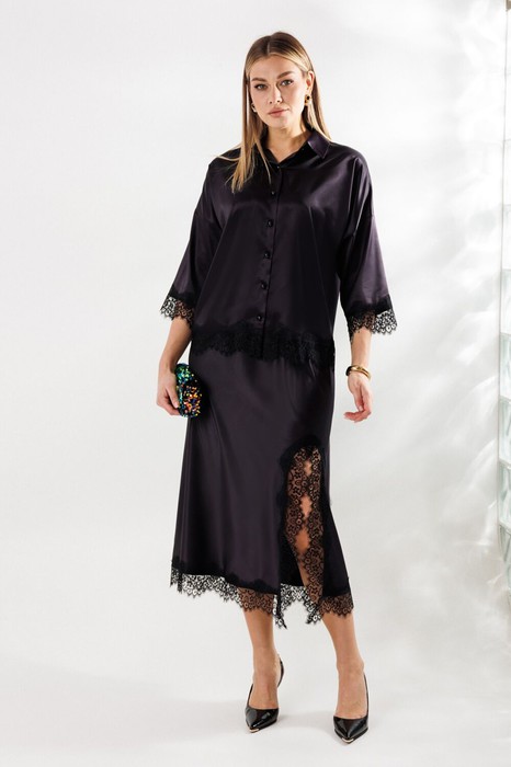 Женский элегантный костюм от Anastasia, подходящий для нарядной и повседневной носки. Костюм женский 2-х предметный из атласной ткани с отделкой из деликатного кружева (блузка, юбка). Ажурное кружево, деликатно украшающее низ костюма, добавляет образу романтичности и утонченности. Отлично подойдет на любой тип фигуры, подчеркнет вашу женственность. Блузка прямого силуэта со спущенным плечом. Застежка- планка на петли и пуговицы. Воротник на отрезной стойке. Рукав одношовный, втачной, 3/4 длины. Юбка косая с разрезом по колену длины миди выполнена из мягкого атласа, который приятно струится по фигуре, создавая женственный и изысканный силуэт. Пояс на резинке. Юбка с кружевом внизу станет идеальным выбором для создания как повседневных, так и праздничных образов. Длина блузки с крудевом (50-54)- 59см, (56-60)- 62см . Длина рукава с кружевом (50-60)- 29см. Длина юбки с кружевом (50-60)- 90 см.