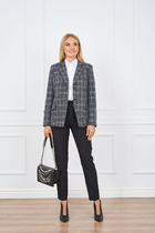 Жилет полуприлегающего силуэта, полочка жилета с вертикальными рельефами, с центральной застежкой на петлю и пуговицу. Горловина V-образной формы, воротник пиджачного типа с отложными лацканами. В рельефе полочки обработаны прорезные карманы. В области талии по полочке с левой стороны выполнен декоративный элемент в виде хлястика с пряжками, и цепью. Цепь сьемная. Спинка со средним швом и вертикальными рельефами. Жилет на подкладке.