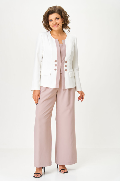 Костюм женский состоящий из топа, жакета и брюк выполнен из однотонной ткани двух контрастных цветов.