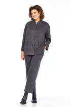 Костюм состоит из жакета и брюк. Костюм выполнен из однотонной ткани. Жакет прямого силуэта, НА ПОДКЛАДКЕ.   Полочка жакета с вертикальными рельефами и двубортной застежкой на две пуговицы. Горловина V-образной формы. На нижней части полочки выполнены накладные карманы. Спинка со средним швом и отрезными бочками. Рукав длинный, втачной, двухшовный. Брюки со стрелками, зауженные к низу. По передним половинкам выполнены наклонные карманы и складки по талии. По задним половинкам обработаны талиевые вытачки. В среднем шве передней половинки брюк обработана застежка на молнию. Брюки на притачном поясе с эластичной тесьмой и застежкой на петлю и пуговицу.