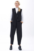 Костюм состоящий из жакета и брюк выполнен из однотонной ткани.