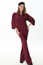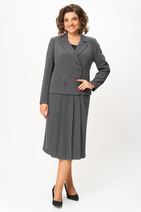 Костюм состоит из жакета и юбки. Костюм выполнен из однотонной ткани. Жакет прямого силуэта, на подкладке.