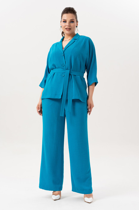 Костюм женский  тройка,  на  любые  мероприятия,  состоящий из  жакета ,брюк и топа. модный соременный. Жакет с воротником пижачного пита, с центральной бортовой застёжкой на 3 петли и 3 пуговицы, полочка с нагрудной вытачкой, с рарзезами по бокам. жакет со сьёмным поясом. Спинка цельная. Брюки женские    прямого кроя, на притачном поясе   с резинкой.. Передние половинки  с   карманами в швах.   Топ прямого силуэта с нагрудными вытачками и с разрезами по боковым швам. Блузка-топ с регулирующей  длину бретелек фурнитурой.