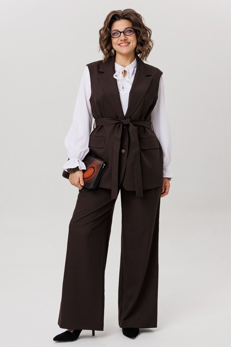 Этот элегантный костюм, состоящий из жилета и брюк, воплощает в себе утонченность и уверенность. Полуприлегающий силуэт жилета мягко подчеркивает линии фигуры, создавая гармоничный баланс между строгостью и женственностью. Однобортная застёжка на петли и пуговицы придает образу аккуратность и завершенность, а отложные лацканы воротника добавляют ноту классической сдержанности.