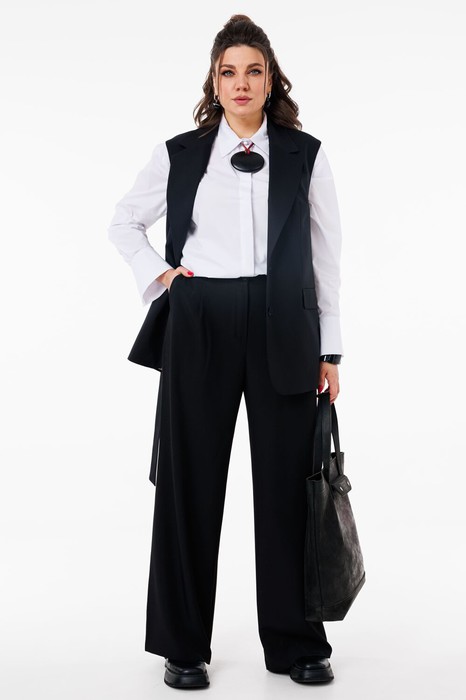 Этот элегантный костюм, состоящий из жилета и брюк, воплощает в себе утонченность и уверенность. Полуприлегающий силуэт жилета мягко подчеркивает линии фигуры, создавая гармоничный баланс между строгостью и женственностью. Однобортная застёжка на петли и пуговицы придает образу аккуратность и завершенность, а отложные лацканы воротника добавляют ноту классической сдержанности.
