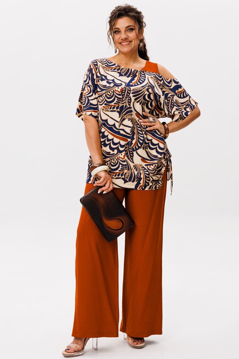 Принт «аффогато-терра» словно всплеск красок на холсте, превращает костюм в произведение искусства. Каждая деталь продумана так, чтобы блузу и брюки можно было легко комбинировать с другими вещами — ансамбль звучит гармонично как в дуэте, так и соло.