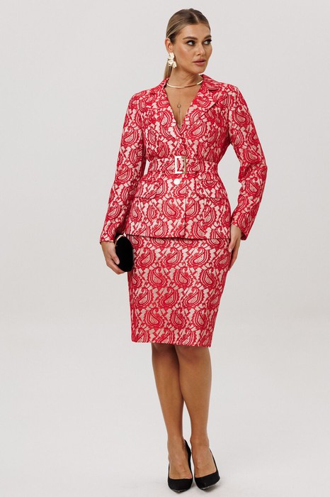 Костюм выполнен в ярком цвете "китайский красный" — цвете, который сочетает в себе женственность, уверенность и одновременно нежность.