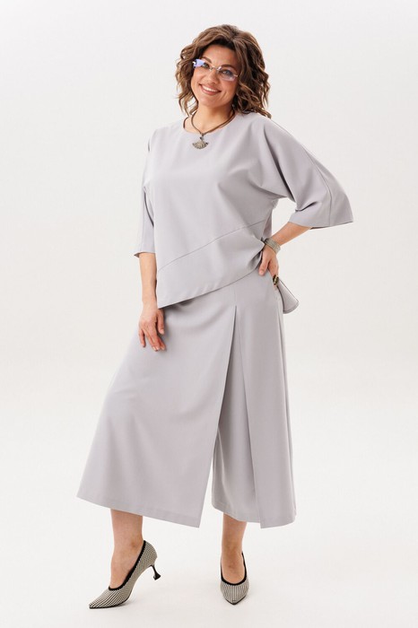 Низ костюма это юбка-брюки-кюлоты на высокой талии, струящиеся и расклешённые. Модель на запах с мягкими складками создаёт ощущение простора и лёгкости, а скрытые, фигурные карманы в швах берегут чистоту линий.