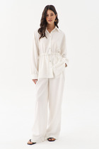 Брюки с притачным поясом, регулируемым шнурком и резинкой внутри, обеспечивают идеальную посадку и комфортную подтяжку талии. Карманы в боковых швах добавляют функциональность и позволяют хранить важные мелочи рядом с вами.