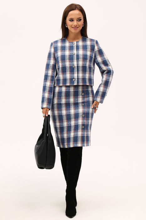 Модный юбочный комплект из костюмной ткани в клетку, состоящий из укороченного прямого жакета и юбки-карандаш, сочетает в себе сдержанность и элегантность. Это один из классических вариантов одежды востребованный для любого случая, отлично подойдет для офиса и работы в прохладное время года.