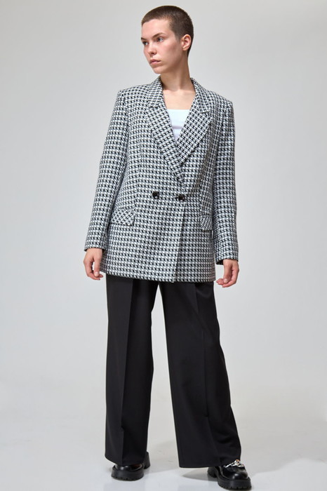 Жакет прямого силуэта, длиной ниже линии бедра, на подкладке, с плечевыми накладками, с двубортной застежкой на петли и пуговицы. Воротник пиджачного типа с отложными лацканами. Перед с талиевыми вытачкам и подрезными бочками, переходящими на спинку, с прорезными карманами в рамку с клапаном. Спинка с средним швом. Рукав втачной двухшовный длинный.