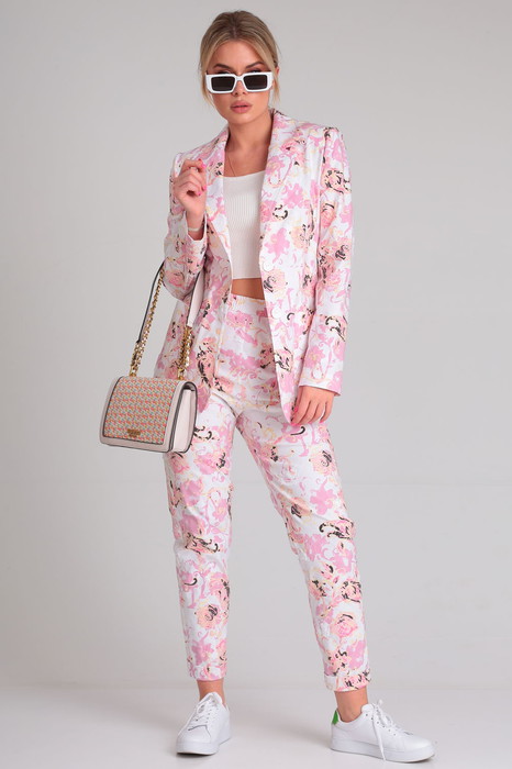 Яркий и эффектный двухпредметный женский комплект состоит из классического жакета и удобных брюк. Комплект выполнен из принтованной хлопковой ткани, которая не сковывает движения и идеальна для теплой погоды.