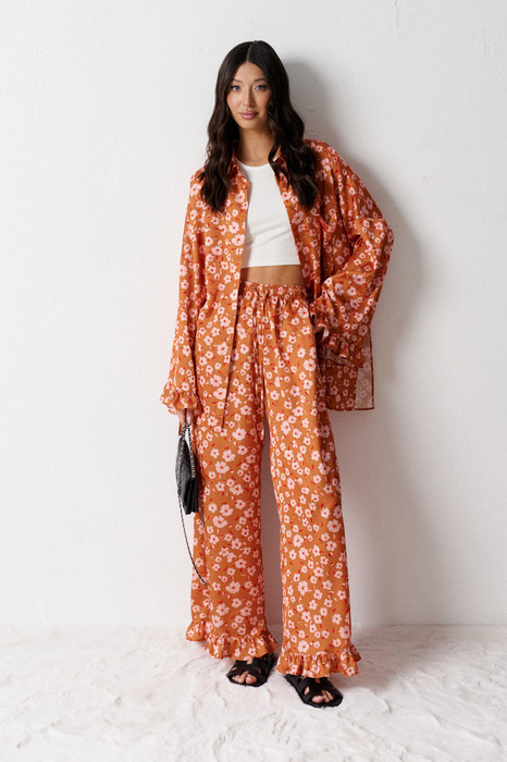 Комплект состоит из рубашки и брюк выполнен из ткани с цветочным принтом. Характеристики: рубашка прямого кроя, отложной воротник на стойке , застежка центральная на петли пуговицы, по переду крупные накладные карманы, рукав свободного кроя спущен, по низу рукава рюша выполнена из ткани основного изделия, в боковых швах разрезы. Брюки прямого кроя, пояс на резинке, в боковых швах карманы, по низу брюк рюша выполнена из ткани основного изделия.