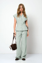 Комплект с шортами выполднен из трикотажного полотна серого цвета. Джемпер прямого широкого кроя, V-образный срез горловины, застежка центральная на петли пуговички, рукав втачной слегка спущен, по низу нашито декоративное кружево. Длина изделия по спинке 56 см, длина рукава от горловины 75 см. Шорты свободного кроя. Пояс на резинке. По передней части имитация застежки на 3 пуговицы. По низу нашито декоративное кружево. Длина 36 см.