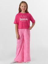 Костюм детский кофта и брюки. Кофта покроя реглан с длинным рукавом. Шов реглана на полочке обработан при помощи декоративного канта. На полочке изделия принт. Горловина округлой формы обработана при помощи узкого воротника. Низ изделия и рукава подгибка. Брюки свободного силуэта с карманом "хулиган". Пояс - настрочная декоративная резинка. Низ изделия подгибка.