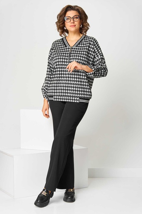 Костюм брючный (двойка) женский полуприлегающего силуэта, состоит из джемпера и брюк. Костюм выполнен и трикотажного полотна и брючной ткани. Джемпер без застежки, рукав длинный с фигурной вставкой. По центру джемпера вставлена молния, по горловине и низу джемпера довяз. Рукав спущенный с патой. Брюки классические, со стрелками на поясе с резинкой. Застежка на гульфик, на тесьму-молнию. Вверху косые карманы.