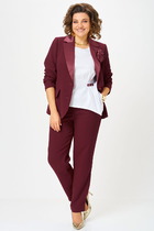 Костюм женский свободного силуэта под пояс, расположенный в боковых швах, состоит из блузки и брюк. Блузка со спущенным рукавом без вытачек по переду и спинке. Горловина округлая, рукав 3/4 на резинке по низу. Брюки на поясе, застежка на гульфик, вверху косые карманы.