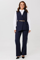 Этот 3-х предметный комплект состоит из жакета, корсетного топа и брюк. Жакет - настоящая жечужина в гардеробе. Небанальный вариант застёжки сбоку на лицевой стороне, и потайной пуговицей внутри изделия придаёт жакету характер, подчёркивает силуэт и линию талии. Жакет выгодно акцентирует фигуру, создавая утончённый и женственный образ. Благодаря декоративным рюшам из вуали, он легко станет центральным элементом образа. Карманы с клапанами. Корсетный топ с открытыми плечами — воплощение чувственной элегантности. Открытые плечи подчеркивают линию шеи и ключиц, а корсетный крой создает безупречный силуэт. Роскошный силуэт и акцентная баска делают его идеальным выбором для особенного вечера. Также топ отлично вписывается в повседневные образы. Брюки станут глотком свежего воздуха среди широких силуэтов и брюк палаццо. Их облегающий крой подчёркивает линию бедёр и тали, а затем изящно расклешается от колена.Такой фасон позволит скорректировать фигуру и подойдёт для строго дресс кода. Вертикальные линии по центру брючин вытягивают силуэт и удлиняют ноги. Застёжка классическая - молния и пуговица в цвет изделия.