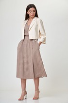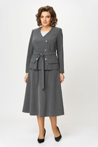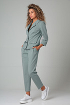 Этот 3-х предметный комплект состоит из жакета, корсетного топа и брюк. Жакет - настоящая жечужина в гардеробе. Небанальный вариант застёжки сбоку на лицевой стороне, и потайной пуговицей внутри изделия придаёт жакету характер, подчёркивает силуэт и линию талии. Жакет выгодно акцентирует фигуру, создавая утончённый и женственный образ. Благодаря декоративным рюшам из вуали, он легко станет центральным элементом образа. Карманы с клапанами. Корсетный топ с открытыми плечами — воплощение чувственной элегантности. Открытые плечи подчеркивают линию шеи и ключиц, а корсетный крой создает безупречный силуэт. Роскошный силуэт и акцентная баска делают его идеальным выбором для особенного вечера. Также топ отлично вписывается в повседневные образы. Брюки станут глотком свежего воздуха среди широких силуэтов и брюк палаццо. Их облегающий крой подчёркивает линию бедёр и тали, а затем изящно расклешается от колена.Такой фасон позволит скорректировать фигуру и подойдёт для строго дресс кода. Вертикальные линии по центру брючин вытягивают силуэт и удлиняют ноги. Застёжка классическая - молния и пуговица в цвет изделия.