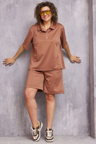 Комплект женский брючный из костюмной ткани с эластаном. Жакет полуприлегающего силуэта, 2-бортный с отложным ассеметричнымворотником, по переду -карманы,рукав втачной со шлицей и пуговицами. Изделие на подкладке. Брюки прямые свободные, с боковыми карманами, на поясе с эластичной тесьмой.