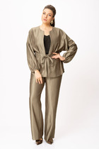Комплект женский юбочный, состоит из жилета и юбки. Жилет укороченный, двубортный с отложным воротником с лацканами, по переду и спинке вертикальный рельефы, по переду обманки-клапаны, изделие на подкладке. Юбка прямая, зауженная к низу, на поясе, застёжка сзади на молнию и пуговицу, с боковыми карманами, сзади шлица, изделие на подкладке.