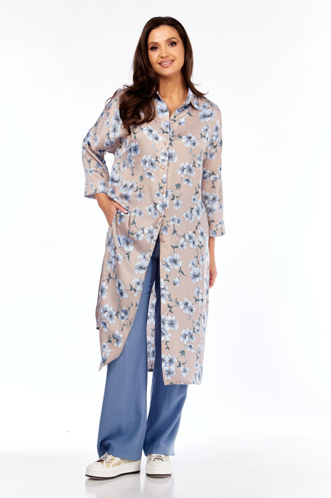 Комплект женский, состоящий из брюк и туники. Туника свободного рубашечного покроя со спущенной проймой и 3/4 рукавом. Застёжка спереди на пуговицы, с боковыми разрезами. Брюки свободные прямые на поясе частично с эластичной тесьмой, с боковыми карманами.