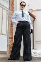 Брюки прямые,по переду с отлетными деталями на запах, на двойном притачном поясе с резинкой по кругу.