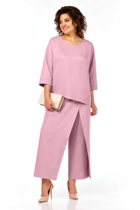 Женский нарядный двухпредметный костюм состоит из блузы и брюк с имитацией юбки спереди,выполнен из плательно-костюмной однотонной ткани с блестящим напылением.