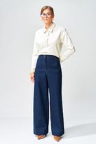 Брюки прямые,по переду с отлетными деталями на запах, на двойном притачном поясе с резинкой по кругу.