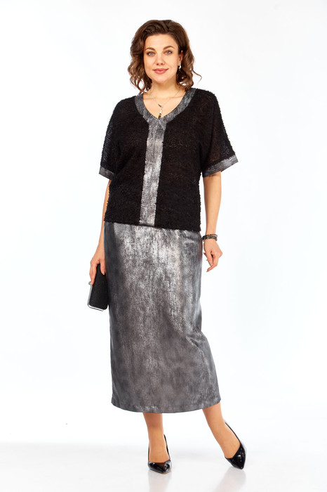 Юбка прямая,зауженная книзу, выполнена из отделочной ткани серебро с эффектом патины.Юбка с талиевыми вытачками ,на притачном поясе с резинкой в области боковых швов и застёжкой на тесьму-молнию и петлю и пуговицу. Заднее полотнище юбки со средним швом, заканчивающимся шлицей. Юбка на трикотажной подкладке.