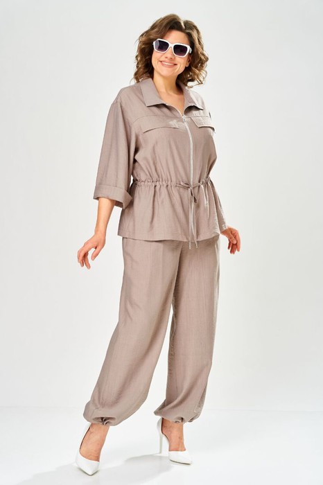 Женский двухпредметный костюм состоит из свободного жакета и широких брюк ,которые можно моделировать по собственному вкусу, выполненных из плательно-костюмной ткани с эффектом жатости.
