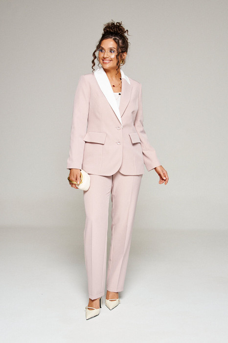 Воротник отрезной фигурный типа «шаль», правая часть которого выполнена из ткани-компаньона смежного оттенка. Низ борта округлой формы. Застежка центральная однобортная низкая на две петли и пуговицы.