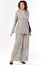 Комплект состоит из 2-х предметов одежды: рубашки и брюк. Выполнен из легких и струящихся тканей мягких оттенков с содержанием натуральных волокон. Брюки и верхняя деталь, имитирующая жилет, из шелковистого полотна. Рубашечная часть комплекта из шифоновой ткани.