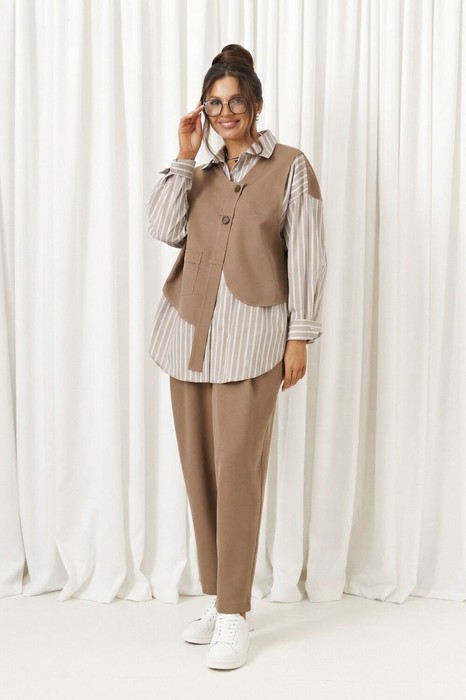Комплект состоит из 2-х предметов одежды: рубашки и брюк. Выполнен из костюмной и рубашечной тканей стильного актуального дизайна с содержанием натуральных волокон. Брюки и верхняя деталь, имитирующая жилет, из костюмного полотна. Рубашечная часть комплекта из хлопковой ткани «в полоску».