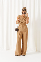 Костюм состоит из 2-х предметов одежды: блузки и брюк. Выполнен из ткани с содержанием натуральных волокон льна и вискозы.