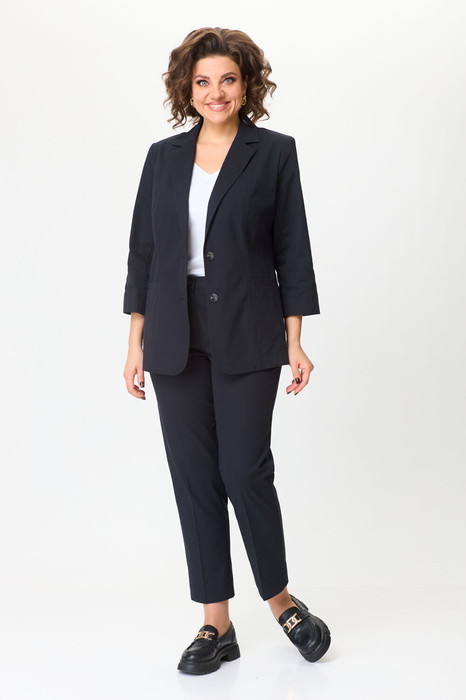 Комплект 2-х предметный из хлопковой ткани, состоит из жакета и и брюк. Жакет женский удлиненный, полуприлегающего силуэта с центральной бортовой застежкой на пуговицы до линии перегиба лацкана. Спереди рельефные швы от плечевого шва, отрезной бочок и карман с клапаном. Спинка с рельефами от плечевого шва. Рукав втачной, двухшовный, 3/4, с небольшим разрезом в локтевом шве. Воротник пиджачного типа. Перед жакета на подкладке. Длина рукава 50, длина по спинке 68 см. Классические брюки, прямые, слегка заужены к низу,заутюжены стрелки,по переду обработаны карманы с отрезным бочком,застежка на тесьму-молнию и 1 пуговицу.На задних половинках обработаны вытачки и имитация карманов в рамку с двумя обтачками,пояс в брюках притачной. По низу брюк в боковом шве есть небольшой разрез. Длина брюк от талии по боковому шву 93 см.