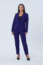 Комплект 2-х предметный состоит из жакета и и брюк. Жакет женский удлиненный,из трикотажной ткани, полуприлегающего силуэта с центральной бортовой застежкой на пуговицы до линии перегиба лацкана. Спереди рельефные швы от плечевого шва, отрезной бочок и карман с клапаном. Спинка с рельефами от плечевого шва. Рукав втачной, двухшовный. Воротник пиджачного типа. Перед жакета на подкладке, длина по спинке 67 см, длина рукава 62 см. Брюки классические,из текстильной ткани, прямые, слегка заужены к низу,заутюжены стрелки,по переду обработаны карманы с отрезным бочком,застежка на тесьму-молнию и 1 пуговицу.На задних половинках обработаны вытачки и имитация карманов с листочкой, пояс в брюках притачной. Длина брюк от талии по боковому шву 100 см.