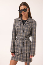 Комплект женский-двойка, из текстильной ткани, жакет удлиненный, полуприлегающего силуэта с центральной бортовой застежкой на пуговицы до линии перегиба лацкана. Спереди рельефные швы от плечевого шва, отрезной бочок и карман с клапаном. Спинка с рельефами от плечевого шва. Рукав втачной, двухшовный. Воротник пиджачного типа. Жакет на подкладке, длина по спинке 67 см, длина рукава 62 см. Брюки прямые, классические, с заутюженными стрелками, по переду обработаны карманы с отрезным бочком, застежка на тесьму-молнию и 1 пуговицу. На задних половинках обработаны вытачки и имитация карманов с листочкой, пояс в брюках притачной. Длина брюк от талии по боковому шву 103 см.