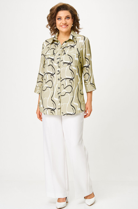 Комплект женский, 2-х предметный, состоит из блузы и и брюк. Блуза женская, прямого силуэта из текстильной ткани. Воротник отложной, застежка центральная на петли-пуговицы. По переду нагрудные вытачки и настрочены накладные карманы. Спинка цельная. Рукав втачной, одношовный, 3/4, с притачной манжетой. В боковых швах по низу небольшие разрезы. Длина по спинке 74 см, длина рукава 45. Брюки-палаццо, средней ширины, из текстильной ткани, выполнены с карманами с отрезным бочком в боковом шве. Пояс притачной, на резинке по боковым швам, застёжка на молнию. По задним половинкам обработаны вытачки. Длина по боковому шву 108 см.